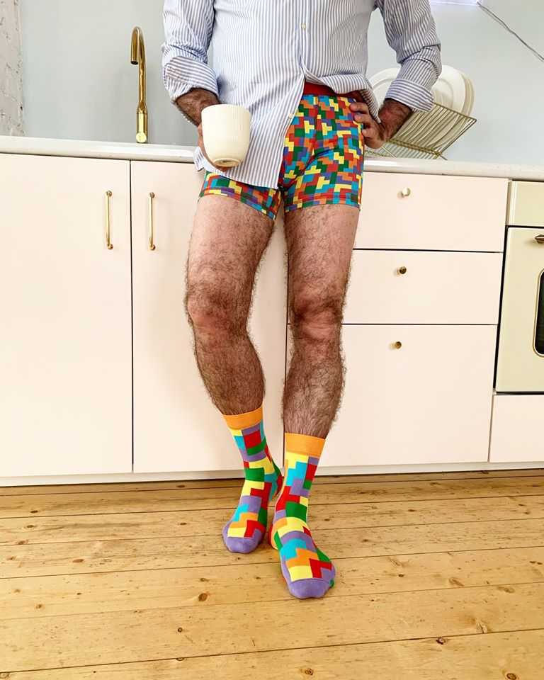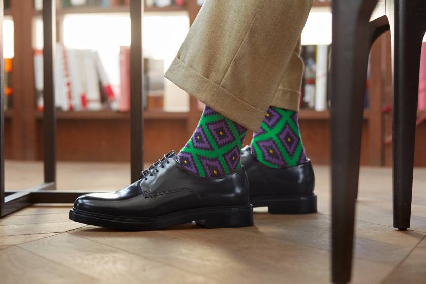 Самый безопасный вариант — носки в тон брюк: это визуально вытягивает силуэт и делает образ аккуратнее. Если хочется чуть больше стиля, выбирайте микропринт в той же палитре: он заметен только вблизи и смотрится профессионально. Под темно-синие брюки хорошо подходят темно-синие или графитовые носки, под серые — серые разных оттенков, под черные — черные или глубокий графит.