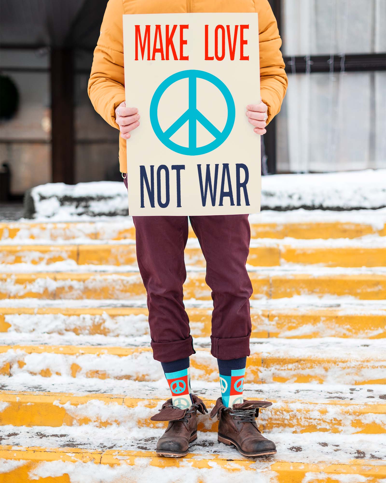 Давайте поддерживать все антивоенные движения, хотя бы таким простым способом, как ношение цветных носков с пацификом. Даешь пропаганду красоты! Тем более что эта пропаганда настолько прекрасна. «Солнечному миру — Да! Да! Да! Ядерному взрыву — Нет! Нет! Нет!»