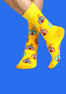 Эти веселые, яркие носочки пленяют своей палитрой. Желтый, энергичный цвет, на фоне которого изображены цирковые шатры — это настоящий коктейль веселья и позитива. Стоит только кинуть взгляд на эти великолепные носки, как происходит взрыв зажигательных эмоций и вот уже тигры и клоуны выходят на арену…